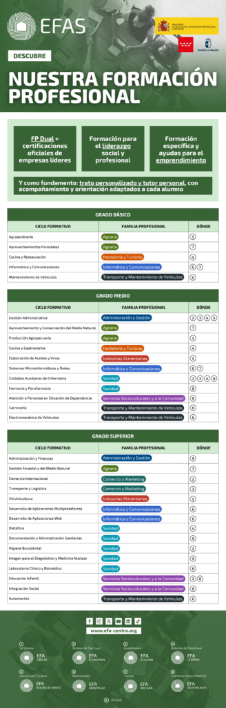 Las EFAS son centros de formación con una amplia trayectoria en Castilla-La Mancha y Madrid, especializados en Formación Profesional y con un modelo educativo único que combina la enseñanza en el aula con la experiencia práctica en empresas, la formación para el liderazgo y el emprendimiento y el trato personalizado a cada alumno.